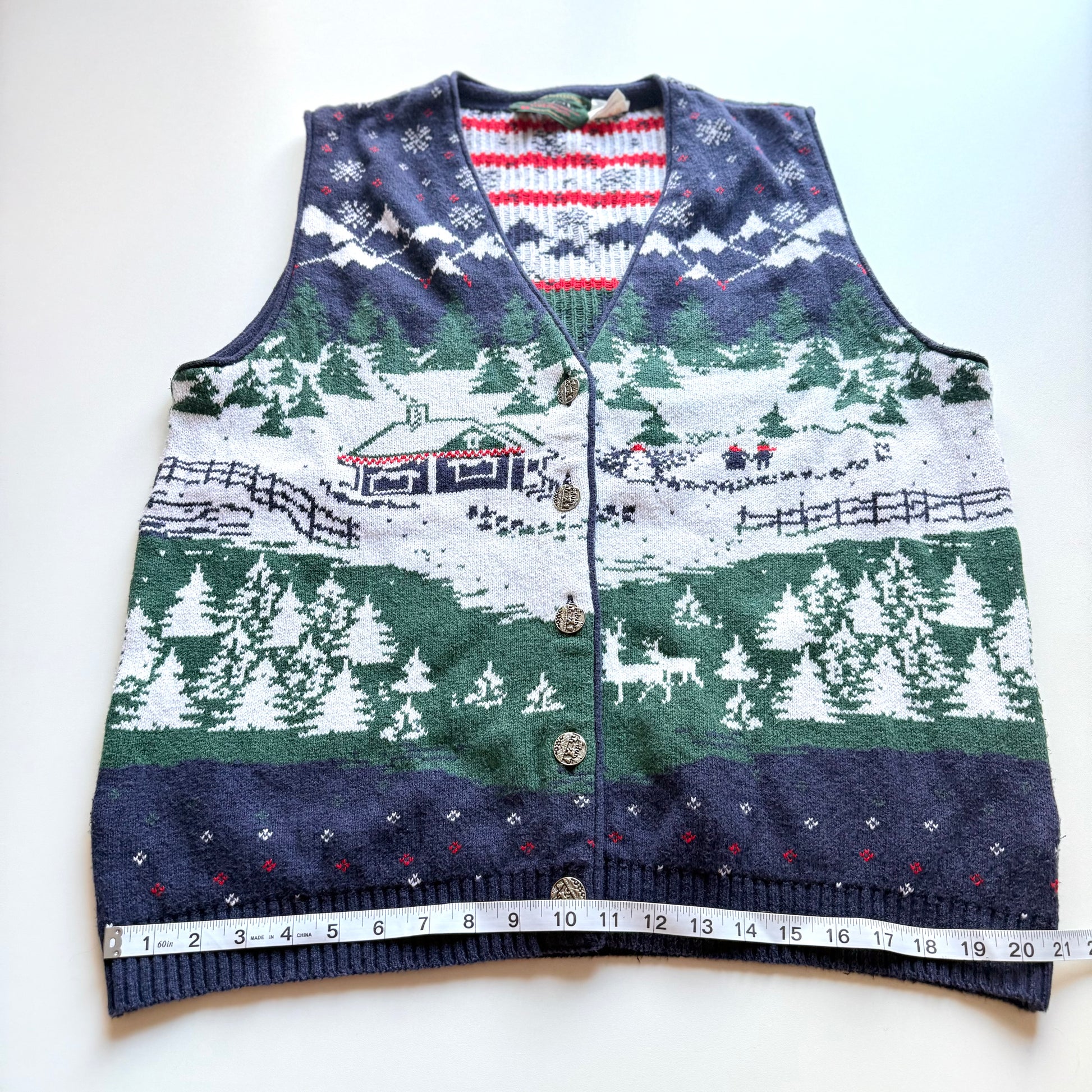 Vintage vest featuring a winter scene that includes deer in a forest area, a festive cabin with a snowman, and snow topped mountains in the background. Even the buttons are holiday approved with deer on them. This sleeveless apparel is from Northern Reflections exclusively by ParkHurst.