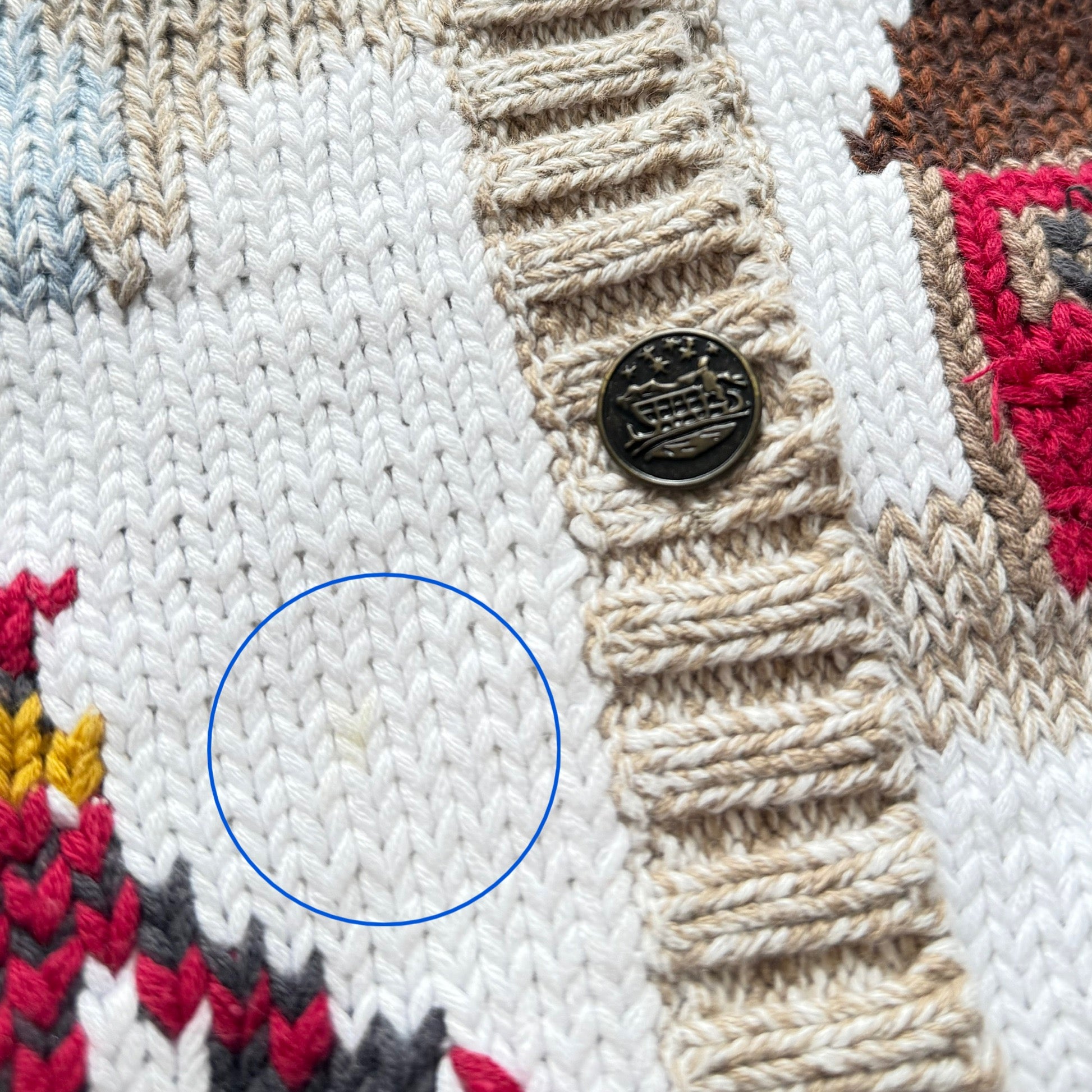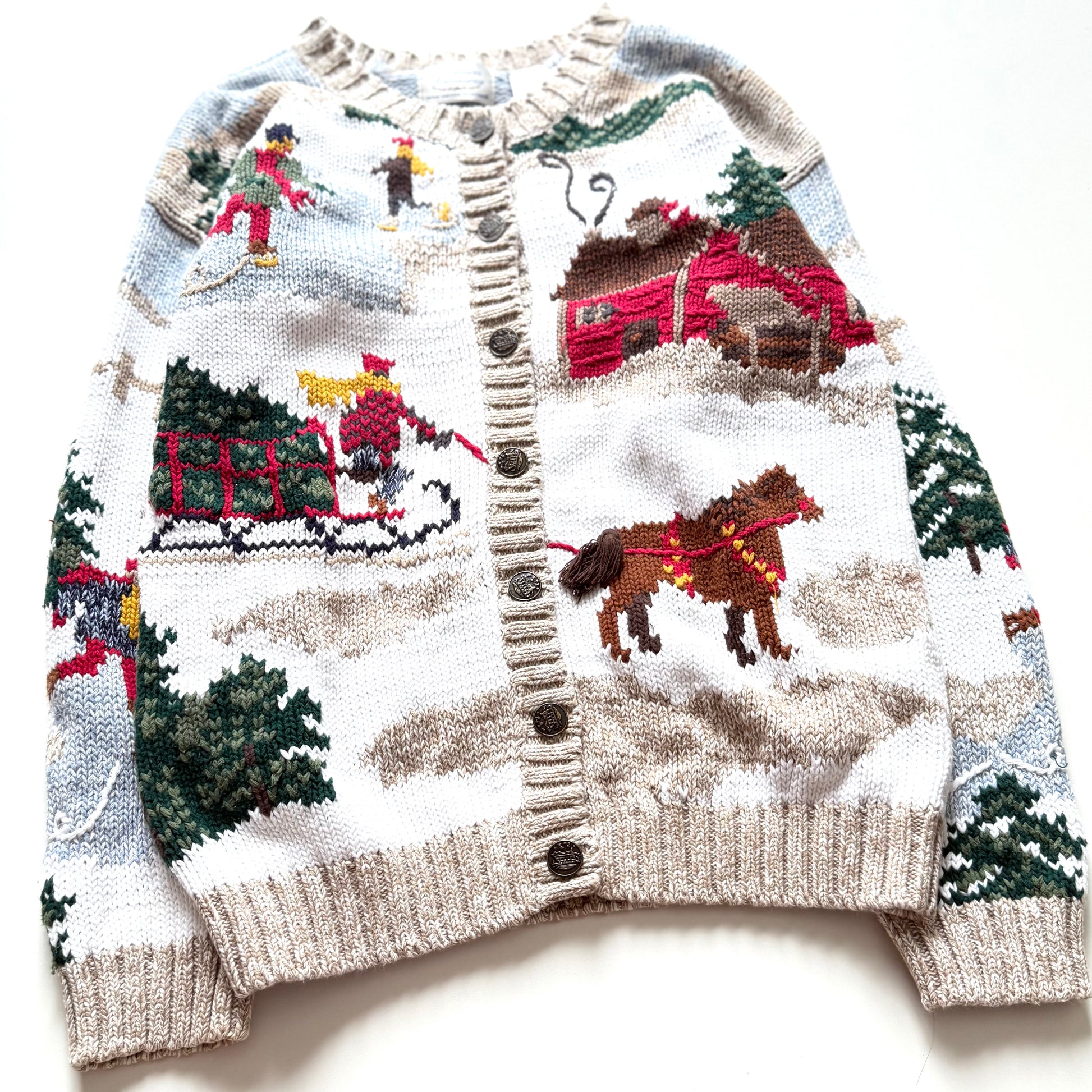 Vintage cardigan, with winter scenes on it. Some of those scenes are a festive horse drawn sleigh, ice skating, and snowy mountain tops. There is a stain on the sweaters arm.