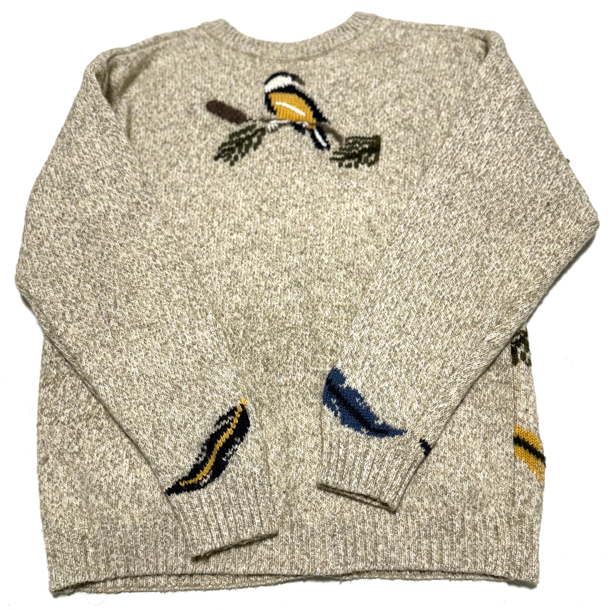Vintage cardigan with various birds, bird houses covered in snow, pine branches, and feathers.