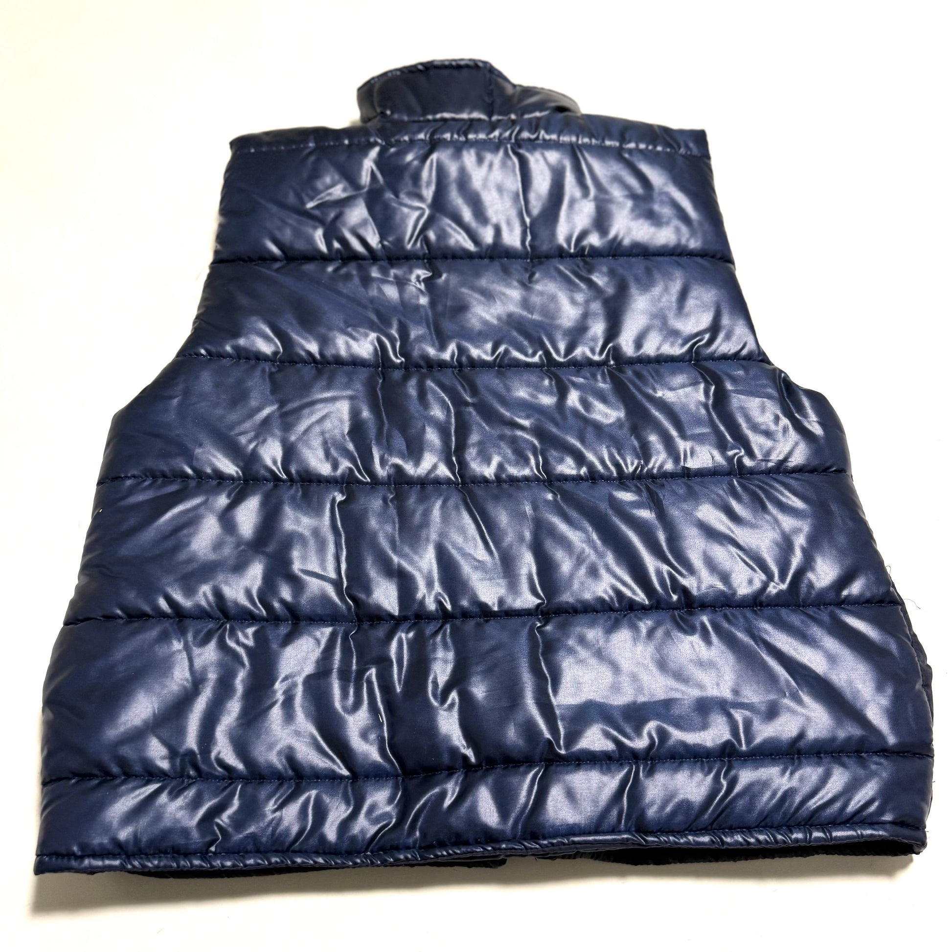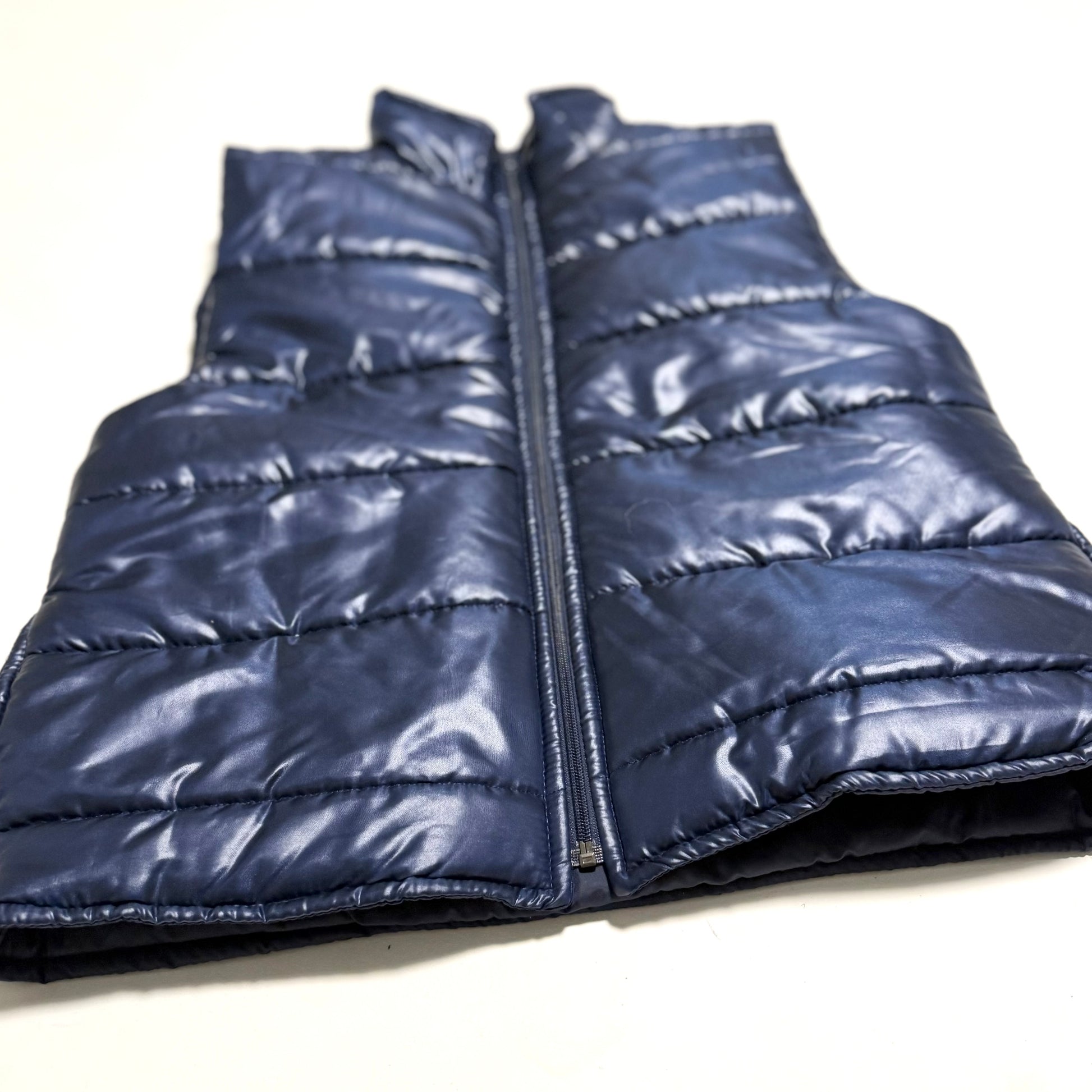Vintage blue puffer vest, with a very shiny / metallic finish.