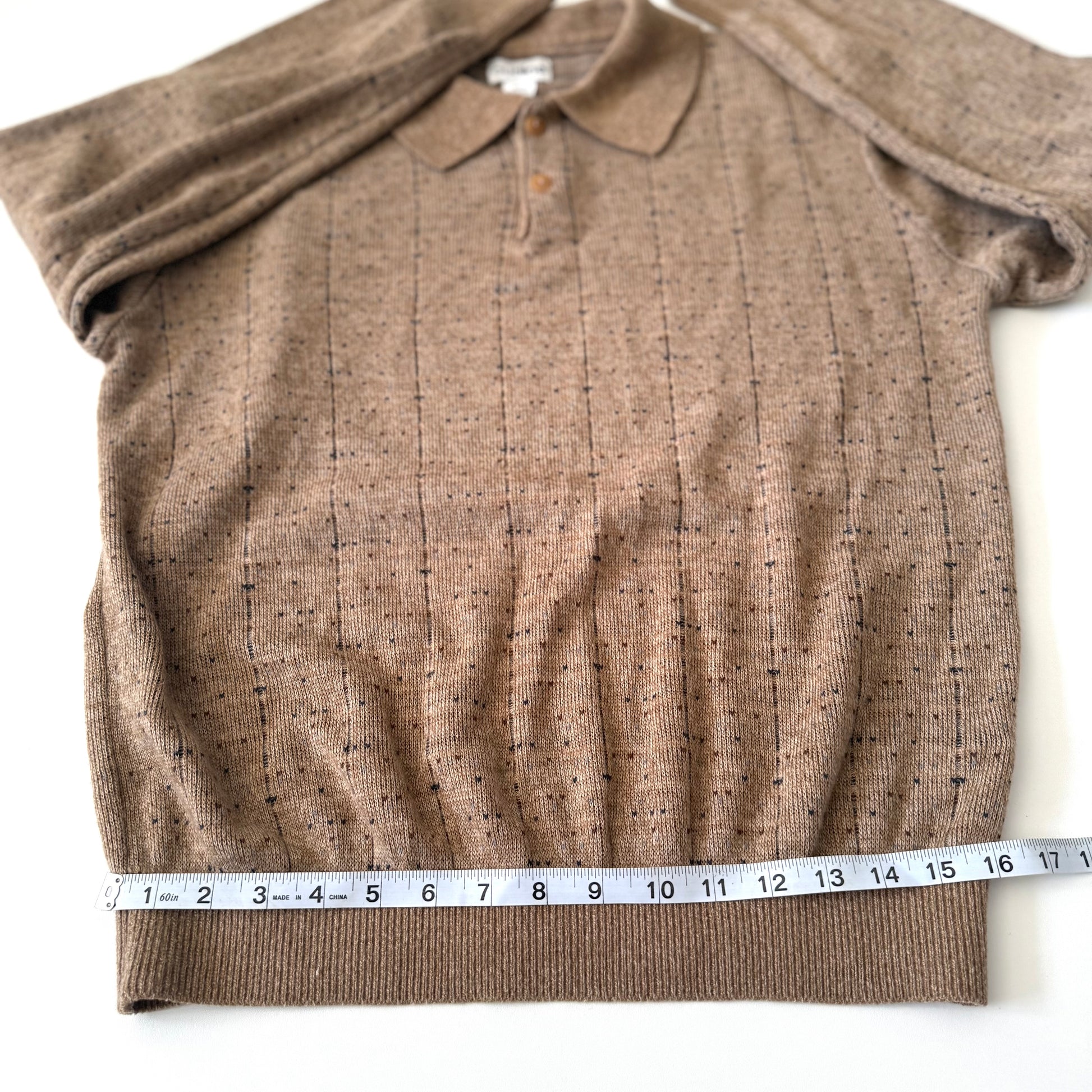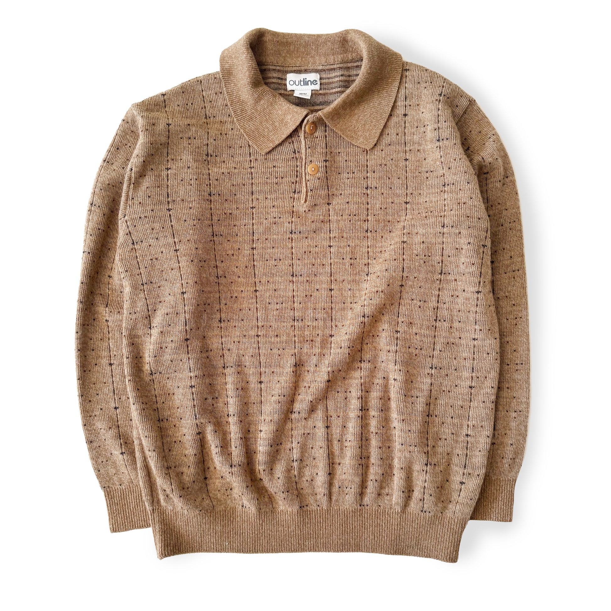 Vintage tan collared knit, with two button close at the top. This is a lighter weight sweater, or a warmer shirt.