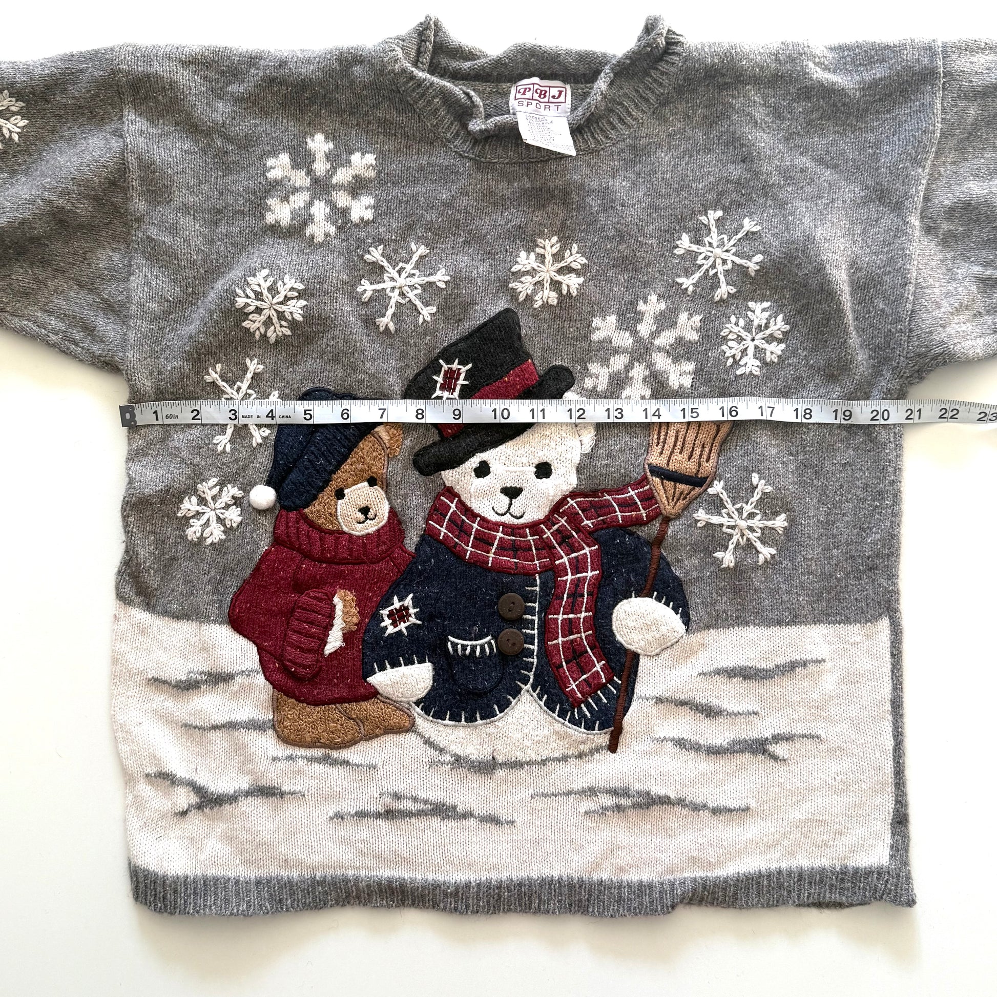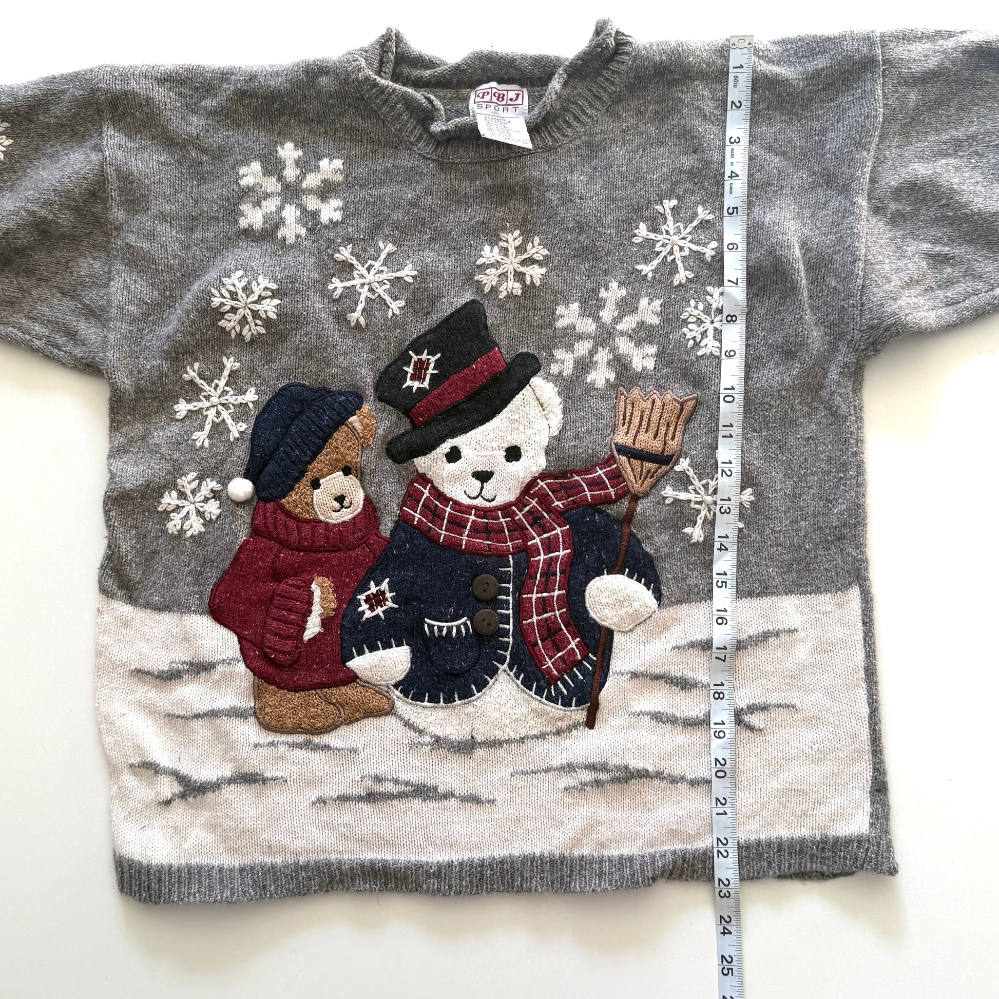 Vintage grey sweater with a bear making a bear shaped snowman on it.