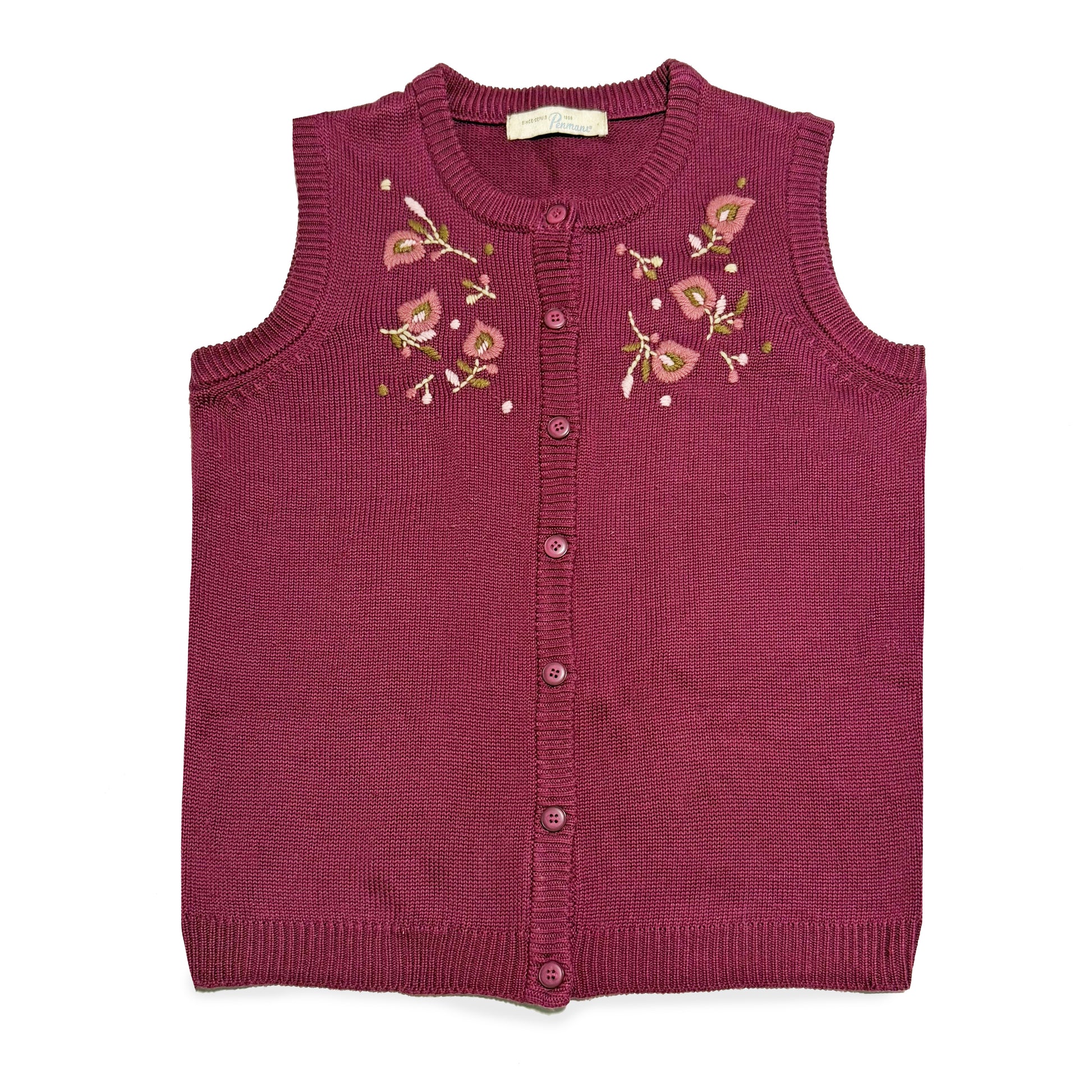 Vintage sleeveless knit top, with a button up front. There are floral / natural leaf patterns embroidered on the top front of the vest in a 90's style.