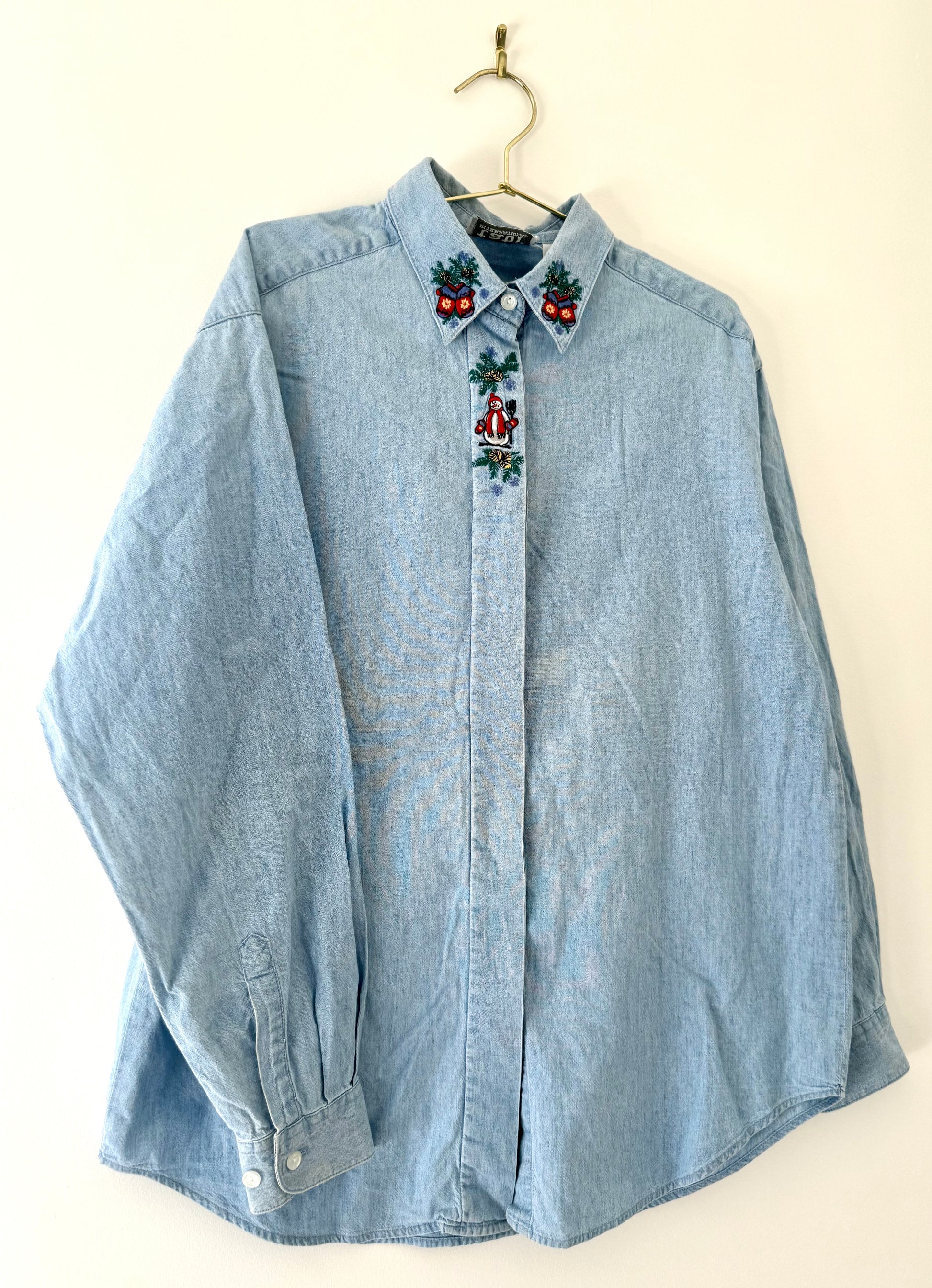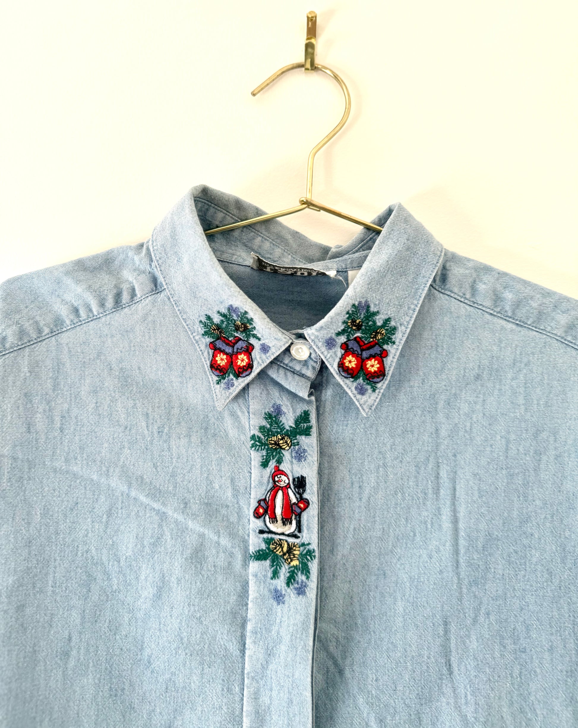 Vintage denim button down shirt, with snowman and festive mittens embroidered on it.