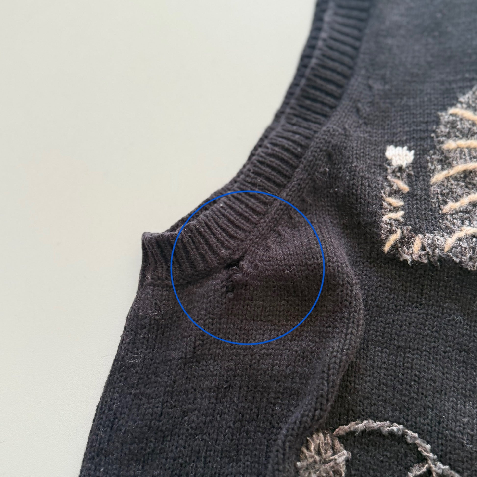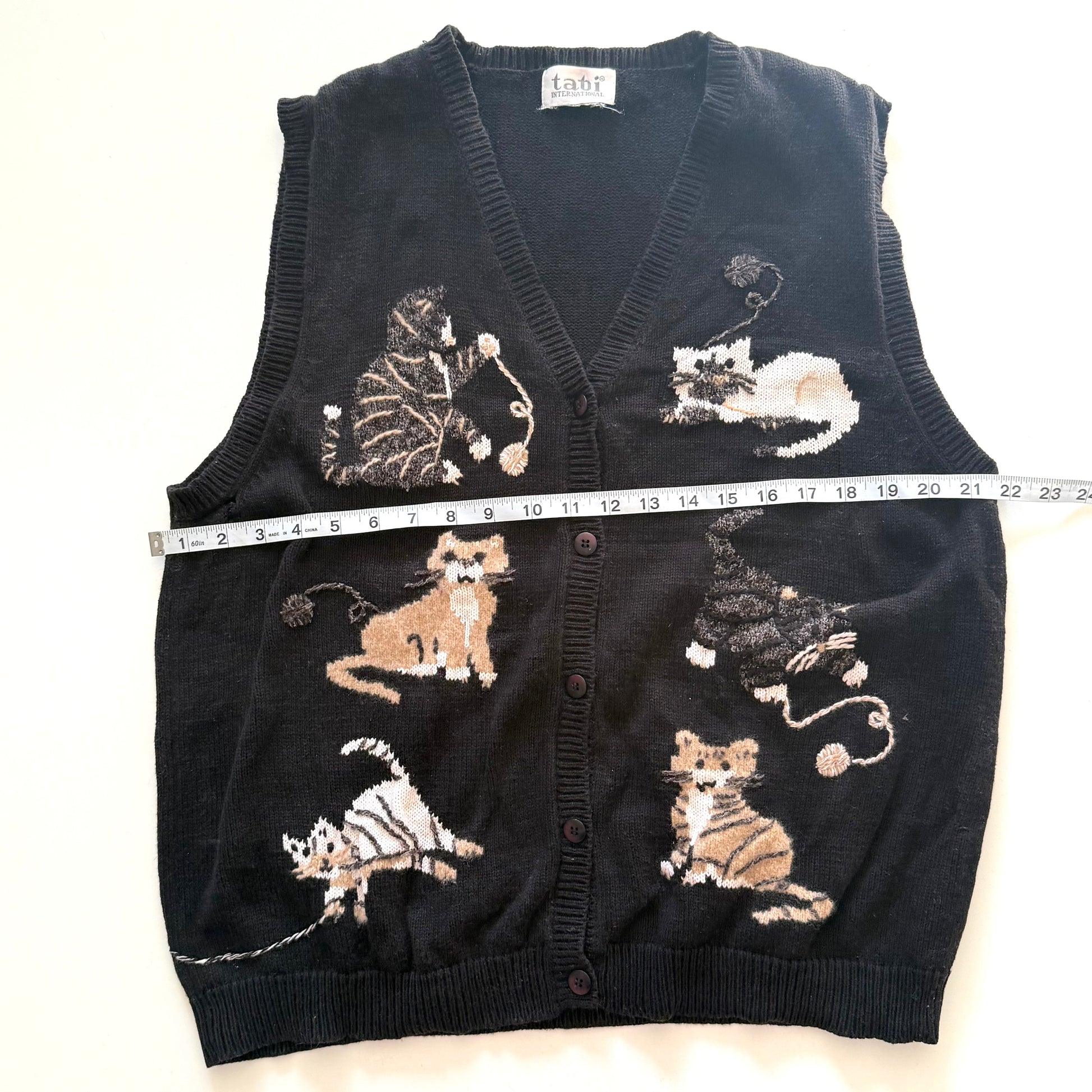 Vintage black knitwear vest, with cats / kittens on it. There is a small hole on one side.