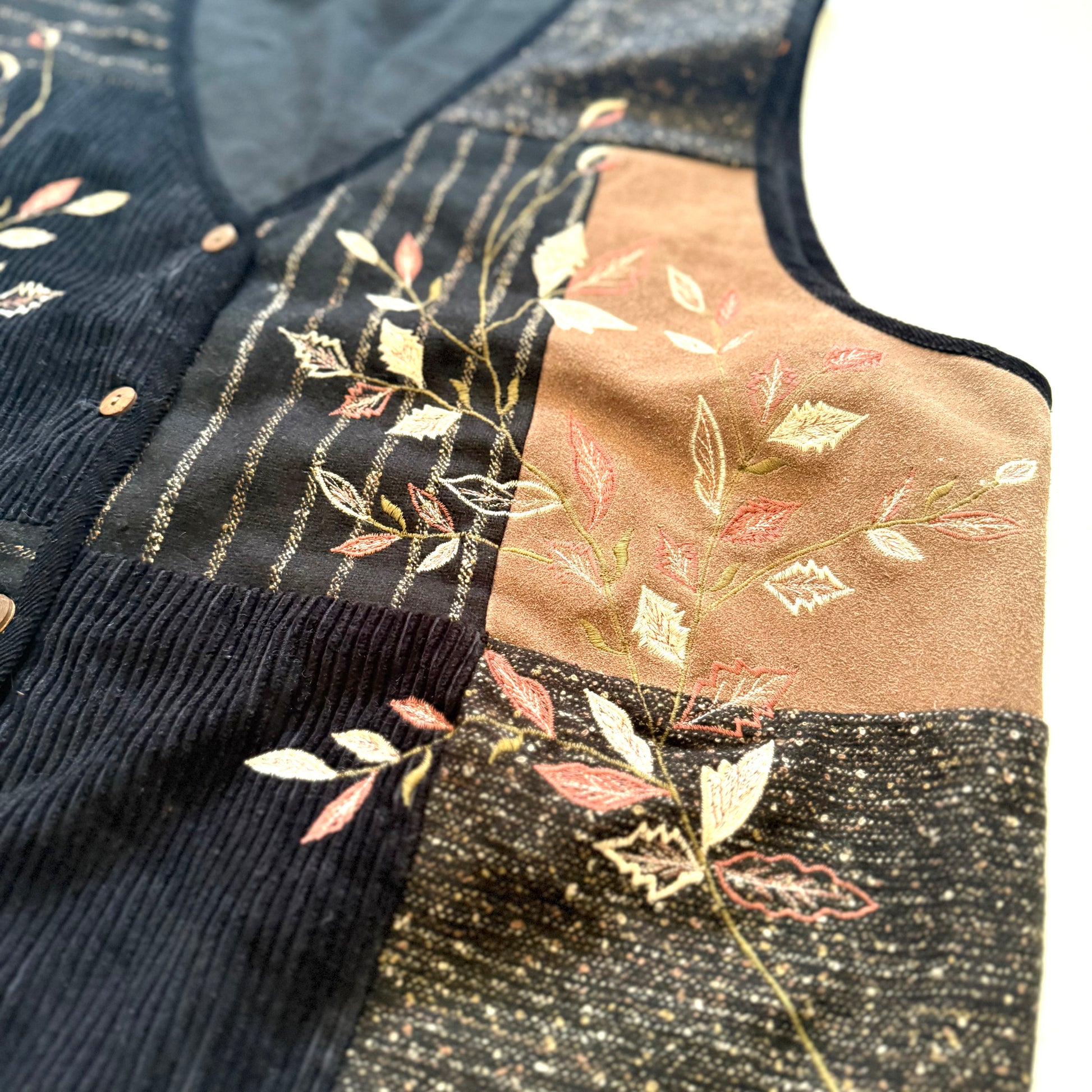 Vintage vest with a patchwork pattern, and leaves embroidered on.
