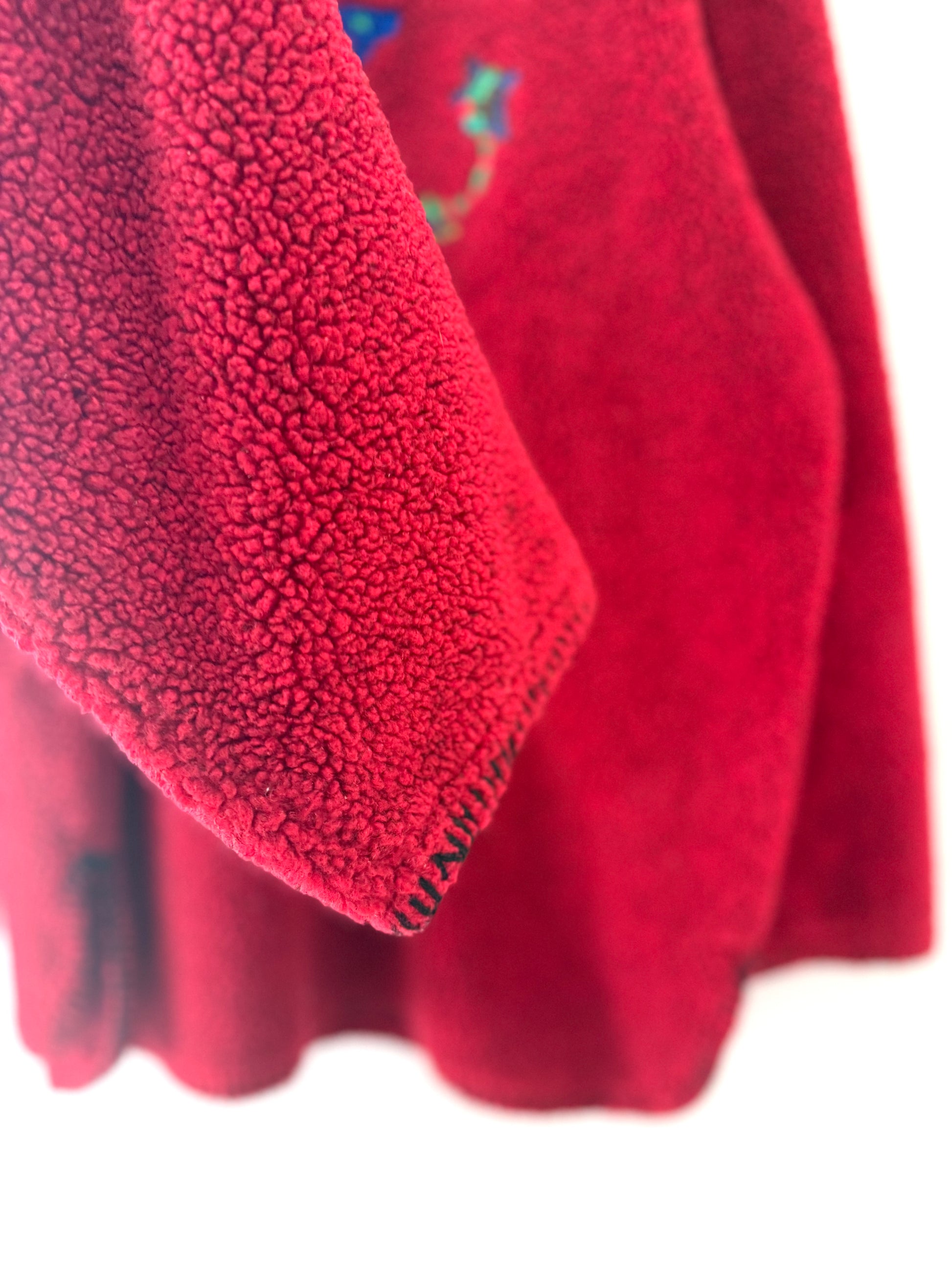 Vintage Y2K style red sweater, in a fleece like material. There is an embroidered angel on the front with other Christmas motifs.