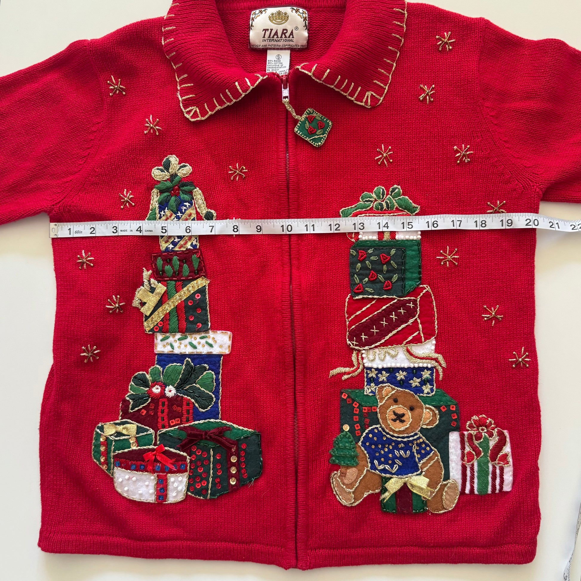 Vintage red collared sweater, with a zipper that has a fabric ornament on it. This cardigan features carious beads, added fabric, bows, tinsel and more to create a great Christmas theme. Based on the provided flat measurements, this festive top could be worn a size up from the manufactured tagged size (small).
