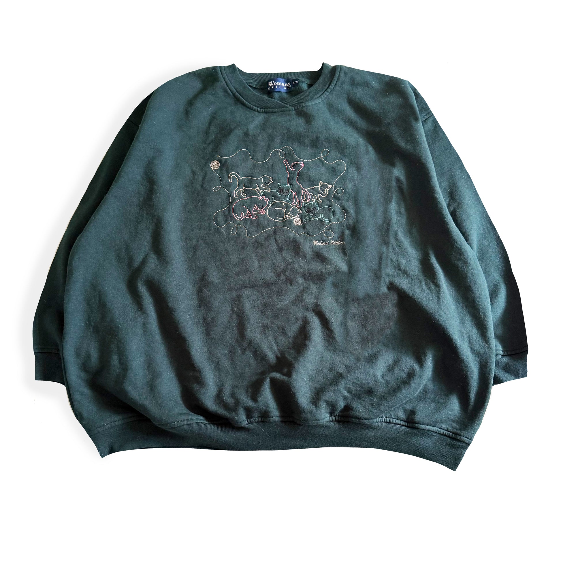 Vintage 90's style sweatshirt with cats playing with yarn embroidered on it.