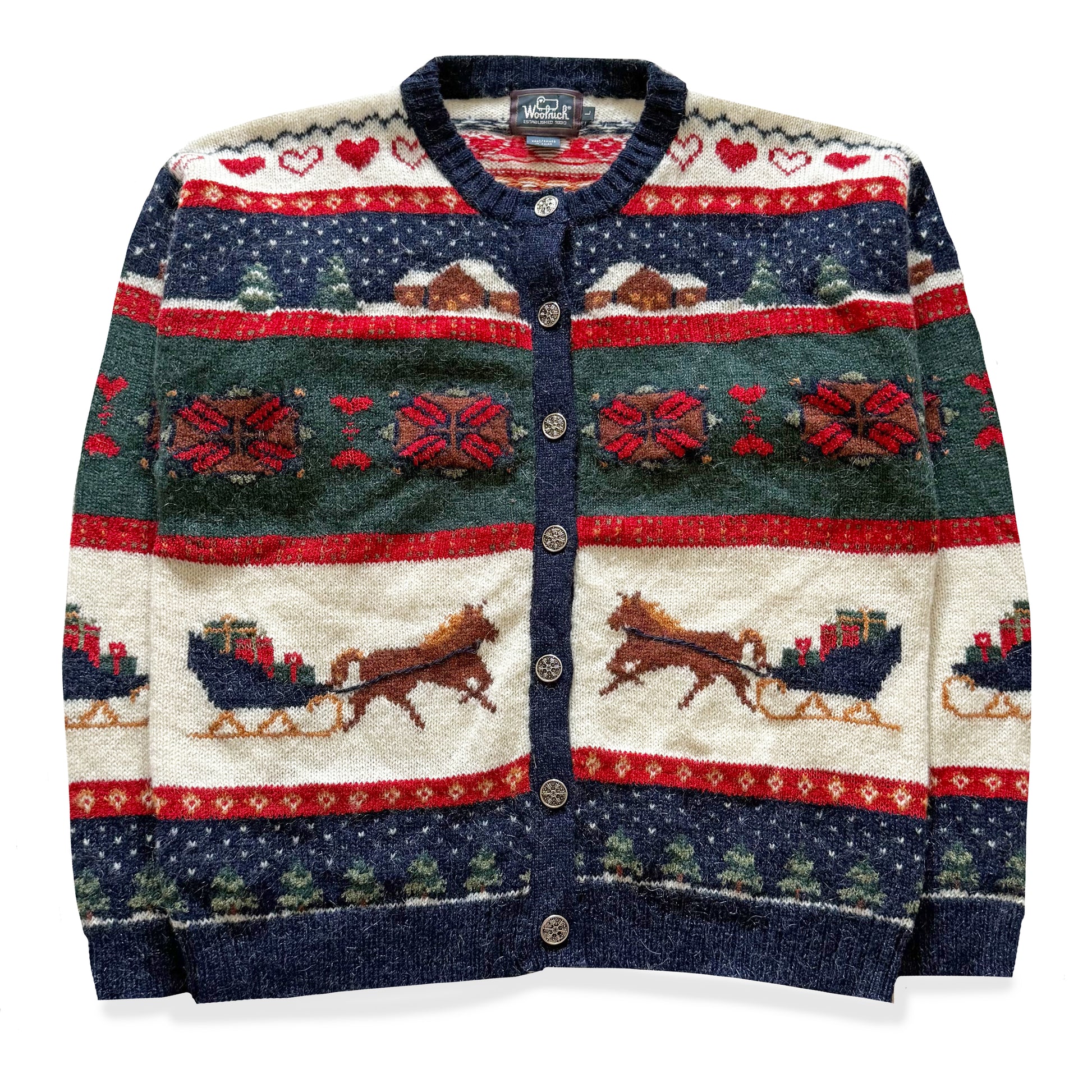 Vintage cardigan featuring a horse drawn sleighs with presents, snow covered cabins, hearts, trees, and more festive motifs. Even the buttons are winter holiday themed with snowflakes on them. There are some small spots of discolouration on the sleeves.